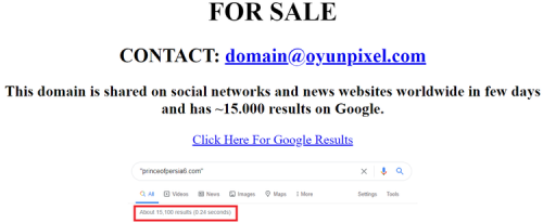 Дождавшись, когда новость о регистрации домена распространится по социальным сетям и различным ресурсам, владелец выставил его на продажу. В описании он отметил, что princeofpersia6.com встречается в результатах поисковой выдачи Google около 15 тысяч раз.