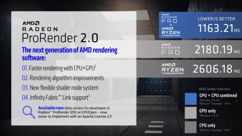AMD Radeon ProRender 2.0 добавляет несколько существенных новых функций и улучшений, в том числе новую гибкую систему узлов шейдеров, поддержку сложной геометрии вне ядра и улучшения алгоритма рендеринга. Radeon ProRender 2.0 также позволяет разработчикам повысить производительность рендеринга своих приложений с помощью улучшенной связки ЦП и ГП: например, AMD Radeon Pro VII в связке с AMD Ryzen Threadripper 3990X с новым движком работает до 1,5 раз быстрее.