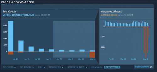 За последние 30 дней на площадке Valve проект id Software получил 10485 отзывов, из которых лишь 50 % положительные. Если посмотреть на график последних обзоров, то можно увидеть, что преимущественное количество отрицательных комментариев игроки оставили с 15 по 18 мая. В этот период DOOM Eternal получила 4482 рецензии с отметкой «не рекомендую». Вот что пишут отдельные пользователи: