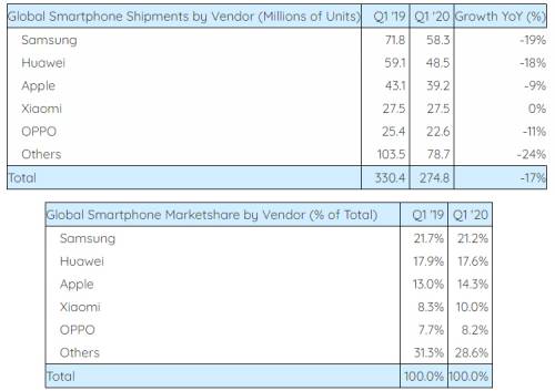 Все ведущие поставщики смартфонов — Samsung, Huawei и Apple — столкнулись с падением продаж: оно составило соответственно 19 %, 18 % и 9 %. И только Xiaomi, находящаяся на четвёртом месте в рейтинге крупнейших поставщиков, смогла сохранить поставки на уровне прошлого года (см. таблицы).