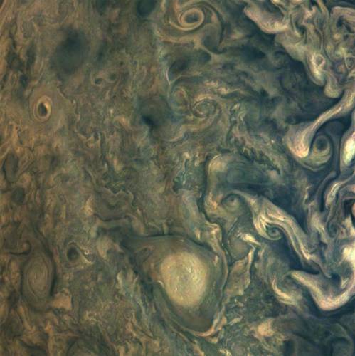 На фотографии запечатлены многочисленные штормы и вихревые образования в атмосфере планеты. Изображение получено во время одного из сближений «Юноны» с газовым гигантом: в момент съёмки станция находилась на удалении около 25 тыс. км от верхней границы атмосферы Юпитера.