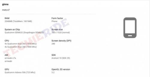 Вторая новинка, Moto E7, оснащена дисплеем формата HD+ с разрешением 1520 × 720 точек. Задействован процессор Snapdragon 632, который содержит восемь ядер Kryo с тактовой частотой до 1,8 ГГц и графический ускоритель Adreno 506. Объём оперативной памяти составляет только 2 Гбайт. Операционная система — Android 10.