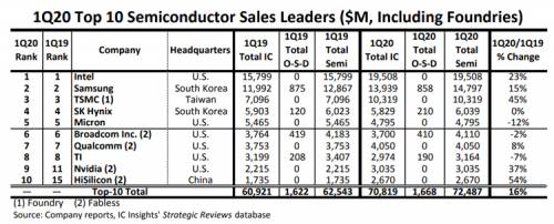 Компания IC Insights подготовила свежий рейтинг крупнейших участников мирового рынка полупроводниковой продукции. В списке за первый квартал 2020 года два новых участника — разработчик графических процессоров NVIDIA и компания HiSilicon, являющаяся подразделением китайского телекоммуникационного гиганта Huawei.