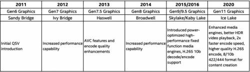 Наиболее продвинутой является встроенная графика Iris Plus Graphics 11-го поколения, которая применяется в последних процессорах Intel Core семейства Ice Lake. По сравнению с графикой 9-го поколения, используемой в процессорах Skylake и Kaby Lake, в Premiere Pro она демонстрирует прирост в 49–82 % в деле перекодирования видео. Преимуществом Intel QSV является возможность использования встроенной в процессор графики для кодирования видео, а дискретной видеокарты — для других ускоряемых с помощью ГП эффектов.