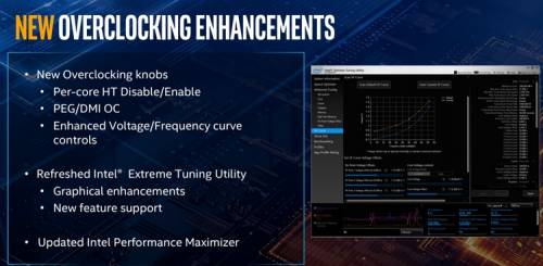 В новом поколении процессоров Intel расширила возможности для ручного разгона процессоров K-серии. Теперь можно включать и отключать технологию Hyper-Threading для каждого ядра отдельно, вручную регулировать кривую напряжения/частоты, а также менять частоту тактового генератора для шины PEG/DMI.