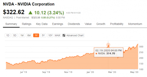 Bank of America тоже ссылается на положительное влияние сделок с Mellanox и Cumulus. По мнению авторов аналитической записки, в долгосрочной перспективе эти активы помогут NVIDIA увеличить долю выручки в серверном сегменте с нынешних 30–35 % до 45–50 %. Специалисты Bank of America считают, что акции NVIDIA вырастут в цене до $360. Накануне они обновили 52-недельный максимум, преодолев рубеж в $324,50 за штуку. На этой неделе глава и основатель компании Дженсен Хуанг (Jen-Hsun Huang) выступит с презентацией, от которой многие источники ожидают дебюта графической архитектуры Ampere. Часть оптимизма инвесторов может быть связана и с этими ожиданиями.