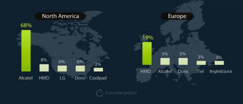 В Северной Америке бесспорным лидером является компания Alcatel, удерживающая 68 % сегмента кнопочных аппаратов.