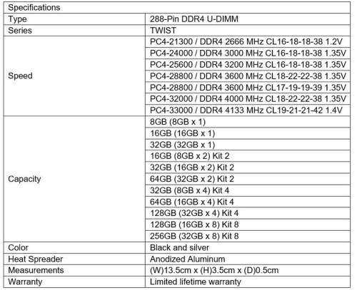 В семейство Twist DDR4 вошли модули с частотой 2666, 3000, 3200, 3600, 4000 и 4133 МГц. Напряжение питания варьируется от 1,2 до 1,4 В.
