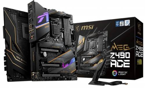 В флагманскую серию MEG на данный момент вошли две материнские платы: MEG Z490 Godlike и MEG Z490 Ace, каждая из которых получила самое продвинутое оснащение. За питание процессорного разъёма LGA 1200 в каждой из них отвечает силовая схема с парой 8-контактных разъёмов и шестнадцатью фазами по 90 А каждая. Для охлаждения силовых элементов цепей питания используются массивные радиаторы с тепловыми трубками и небольшими вентиляторами.