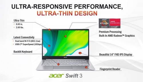 Модель Acer Swift 3 (SF314-42), о которой идёт речь – это сверхтонкий (толщиной до 16 мм) и лёгкий (массой 1,2 кг) компьютер с 14-дюймовым IPS-экраном с разрешением Full HD и тонкими рамками, который помимо процессоров Ryzen 3 4300U, Ryzen 5 4500U или Ryzen 7 4700U может быть оснащён 8 или 16 Гбайт LPDDR4-памяти, SSD объёмом от 256 Гбайт и интегрированным видеоускорителем Radeon Vega. В числе плюсов этой модели отмечается продолжительное время работы от аккумулятора, которое может достигать 11 часов, и качественная клавиатура с подсветкой.