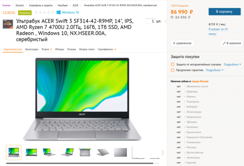 Мобильный компьютер Acer Swift 3 (SF314-42) в конце прошлой недели действительно можно было приобрести в магазинах федерального ритейлера «Ситилинк». Директор по закупкам компании Олег Пчельников подтвердил нам: «Да, мы действительно стали первым партнером Acer в реализации новинки на российском рынке. Развитая логистическая система позволила нам выполнить оперативную поставку ноутбуков на процессорах Ryzen 4000-й серии с новой архитектурой Zen 2 и открыть продажи мобильных компьютеров нового поколения».