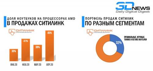 О высоком спросе на мобильные системы, построенные на процессорах AMD, нам рассказали и в «Ситилинке». «Как показывает наша практика работы с ноутбуками на базе AMD, такие модели пользуются большим спросом. Сегодня на их долю в компании приходится порядка 40 %. Более того, несмотря на ситуацию на рынке, продажи премиальных и производительных моделей продолжают расти. Иллюстрацией может быть модель Acer Swift», — подтверждает Олег Пчельников.