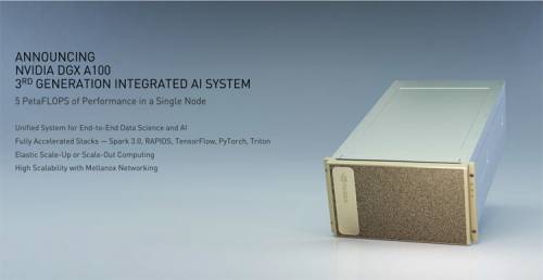 В состав системы DGX A100, основу которой Дженсен Хуанг (Jen-Hsun Huang) на днях вынимал из духовки, входят восемь графических процессоров A100, шесть коммутаторов NVLink 3.0, девять сетевых контроллеров Mellanox, два процессора AMD EPYC поколения Rome с 64 ядрами, 1 Тбайт оперативной памяти и 15 Тбайт твердотельных накопителей с поддержкой NVMe.