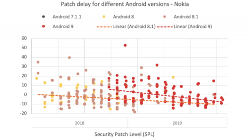 Исследователи из SRLabs для сбора данных о времени доставки обновлений использовали приложение SnoopSnitch, установленное на более чем 500 000 смартфонов с Android. Было отмечено, что в целом время задержки исправлений Android сократилось примерно на 15 %. Исследование показало, что быстрее всех ежемесячные обновления безопасности до пользовательских Android-устройств доставляют Google, Nokia и Sony. Медленнее всего эту работу выполняют Xiaomi, HTC и Vivo.