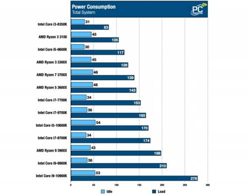 После множества слухов и шокирующих предположений по поводу энергетических аппетитов, мы не смогли обойти стороной вопрос тепловыделения и потребления Core i9-10900K. Новинка оказалась и вправду весьма прожорливой: в простое вся система с этим процессором потребляла 53 Вт, а под нагрузкой — 278 Вт. Аналогичная конфигурация на Core i9-9900K потребляла 36 и 210 Вт соответственно, а на Ryzen 9 3900X — 43 и 198 Вт соответственно. По данным другого источника, новый чип Intel действительно способен в одиночку затребовать до 254 Вт энергии.