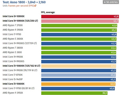 А вот в более высоком разрешении 4K (3840 × 2160 точек) процессор Core i9-10900K почему-то уступил соперникам во многих тестах. Местами он проиграл даже шестиядерным Core i5-9400F и Core i5-10600K. Более того, в отдельных ситуациях производительнее нового флагмана Intel оказался и народный AMD Ryzen 5 3600. Тем не менее, в среднем быстродействие нового процессора Intel Core i9-10900K оказалась на очень высоком уровне.