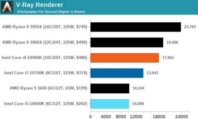 Работа с архивами в 7-Zip показала аналогичную картину: Core i9-10900K немного не дотянул до Ryzen 9 3900X, тогда как в WinRar чип Intel оказался быстрее. При кодировании и декодировании видео в Handbrake процессор Intel максимально приблизился к 16-ядерному Ryzen 9 3950X при использовании кодека HEVC, а вот с более старым x264 оказался немного медленнее Ryzen 9 3900X.
