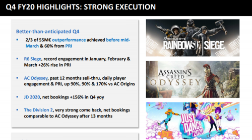 В первом квартале фискального 2021 года (1 апреля — 30 июня) Ubisoft ожидает продать товаров на €335 млн. На этот период запланированы второй сезон обновлений For Honor и второй сезон пятого года обновлений Rainbow Six Siege. За весь год компания рассчитывает получить €400–600 млн операционной прибыли и €2,35 –2,65 млрд чистых поступлений.