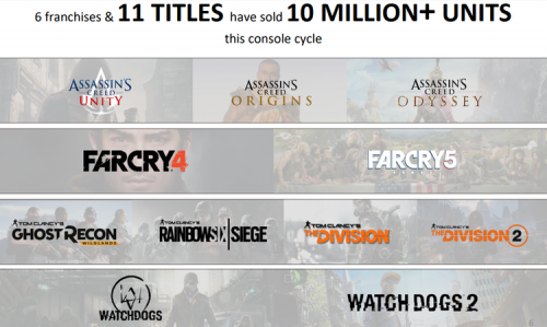 Также компания рассказала, что за текущий консольный цикл отметку в десять миллионов копий перешагнули 11 игр: Assassin’s Creed Unity, Assassin’s Creed Origins, Assassin’s Creed Odyssey, Tom Clancy’s The Division, Tom Clancy’s The Division 2, Far Cry 4, Far Cry 5, Tom Clancy’s Ghost Recon: Wildlands, Tom Clancy’s Rainbow Six Siege, Watch Dogs и Watch Dogs 2.