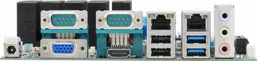 Материнская плата снабжена двухпортовым гигабитным сетевым контроллером Realtek RTL8111HS и звуковым кодеком Realtek ALC269. На интерфейсную панель выведены два последовательных (СОМ) порта, разъёмы HDMI и D-Sub, два гнезда для сетевых кабелей, по два порта USB 3.0 и USB 2.0, набор аудиогнёзд.