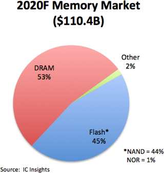 Весь прошлый год производители памяти пытались сократить выпуск DRAM и 3D NAND, что отчасти помогло стабилизировать цены. До того, как пандемия нового короновируса оказала существенное влияние на мировую экономику, IC Insights прогнозировали рост выручки производителей памяти на 14 % по сравнению с прошлым годом. Однако, пандемия вируса SARS-CoV-2, глобальный карантин, сложности с производством, закрытие розничных магазинов и экономический спад заставили аналитиков изменить прогноз. Сейчас в IC Insights считают, что доход производителей DRAM и NAND останется на уровне 2019 года. При этом, DRAM-бизнес принесёт 53 % доходов производителей, а NAND-бизнес принесёт 45 % выручки. Лишь 2 % выручки изготовителей придутся на другие типы памяти.