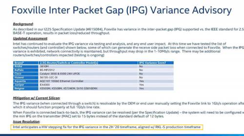 Так, сетевые контроллеры Intel без проблем передавали пакеты активному сетевому оборудованию компаний Aruba, Buffalo, Cisco и Huawei. При работе с оборудованием компаний Aquantia, Juniper и Netgear часть пакетов терялись, что вело к снижению скорости передачи данных до 10 Мбит/с. По сообщению Intel, в контроллерах «Foxville» оказался дефект, который вызывал отклонения в межпакетном интервале относительно установленного в стандарте IEEE 2.5 GBASE-T значения.