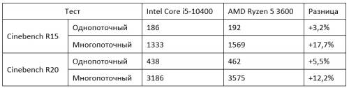 Несмотря на это, Ryzen 5 3600 в Cinebench R15 и R20 уверенно обходит новинку Intel как в однопоточной, так и многопоточной нагрузках. Наибольшая разница до 17 % наблюдается в многопоточных тестах.