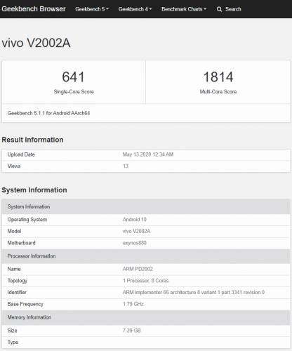В базе данных популярного бенчмарка Geekbench появилась информация о новом смартфоне китайской компании Vivo, который фигурирует под кодовым обозначением V2002A.