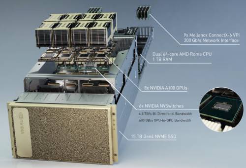 Кроме ускорителей вычислений, процессоры AMD EPYC Rome обеспечивают скоростным интерфейсом PCIe 4.0 и твердотельные накопители. В системе DGX A100 используется пара накопителей M.2 NVMe по 1,92 Тбайт под операционную систему и ещё четыре SSD-накопителя U.2 NVMe по 3,84 Тбайт каждый для хранения данных.